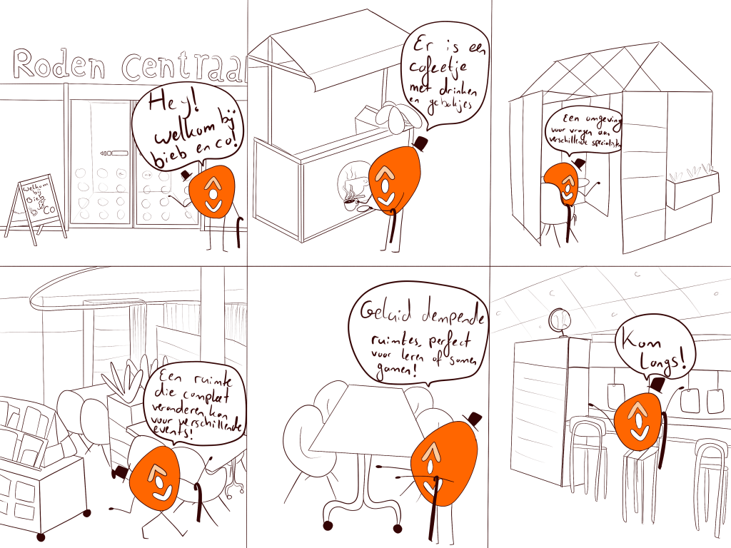 De mascotte voor de bibliotheek heb ik ook bedacht. Het moest aansluiten bij een doelgroep van 12 tot 17 jaar. Ik had een aantal schetsen gemaakt, hieruit hebben we een keuze gemaakt en deze hebben we via een enquette bij de doelgroep voor gelegd. De mascotte is ook gebruikt voor het filmpje, waarvoor ik een storyboard heb gemaakt.